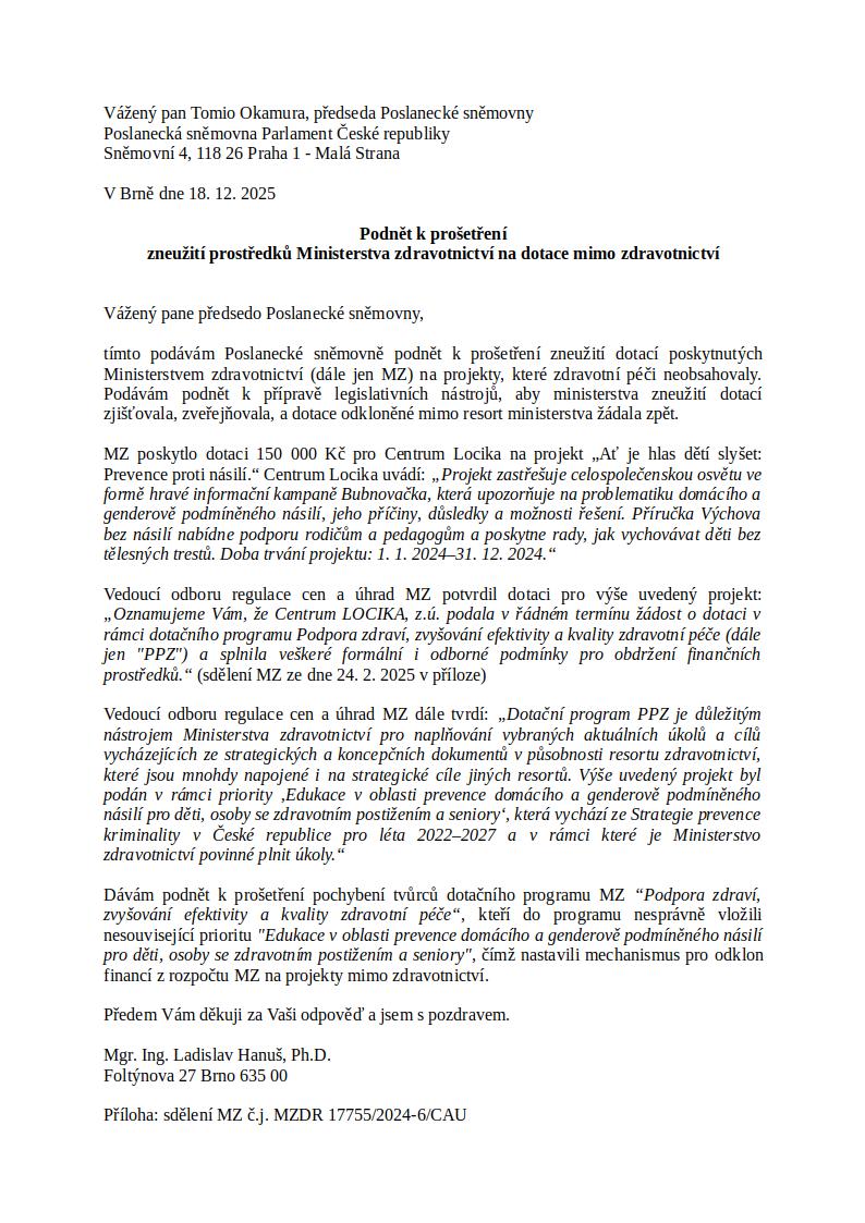 Občanský podnět Poslanecké sněmovně k prošetření odklánění financí z ministerstev mimo resorty na pochybné dotace. Na rok 2024 dostalo Centrum Locika na genderový projekt, který neobsahoval žádnou zdravotní péči dotaci 150 000 Kč z Ministerstva zdravotnictví. Ve zdravotnictví nejsou potřeba finance? Proč zdravotnictví platilo Centru Locika jen akci...