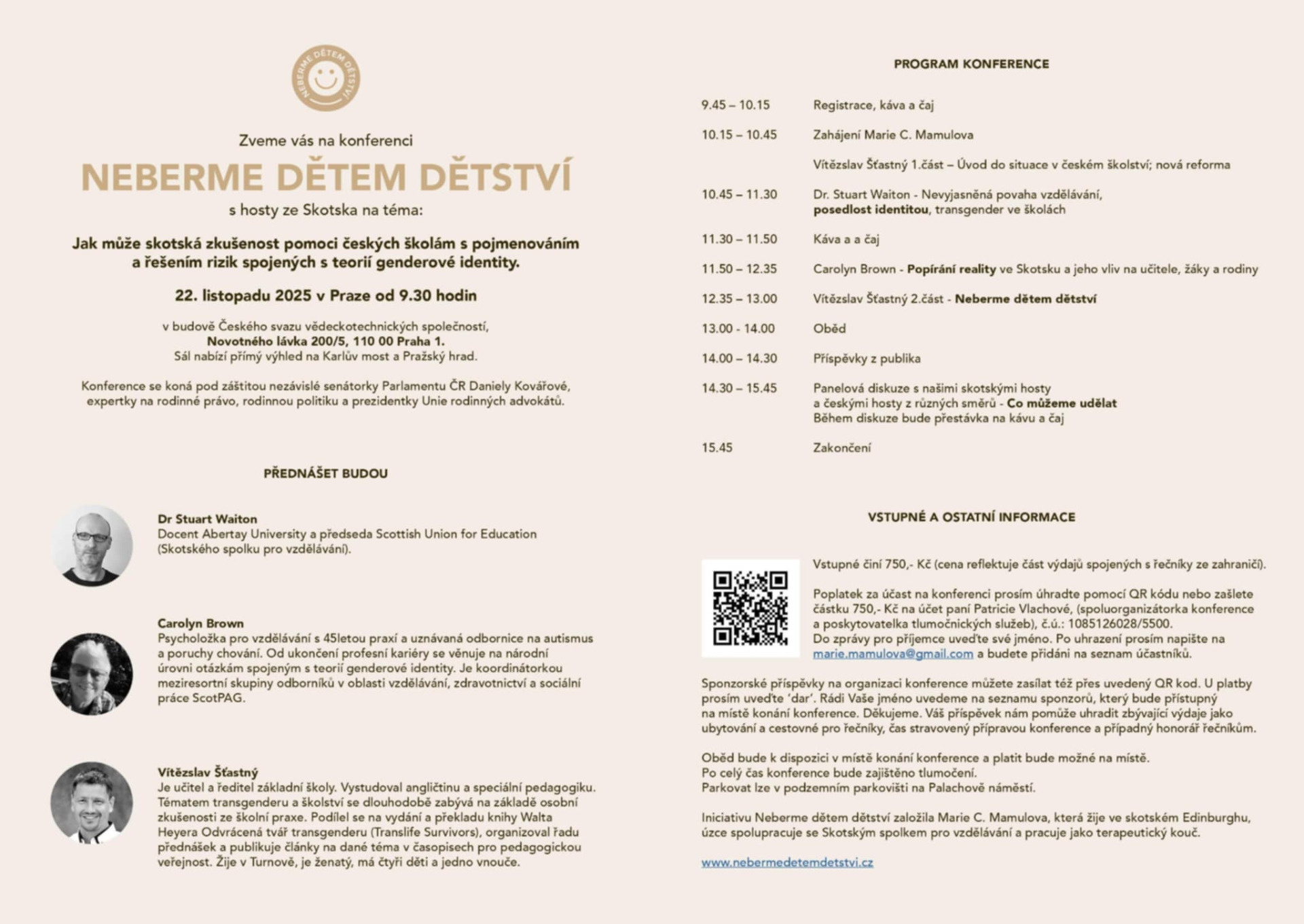 Iniciativa Neberme dětem dětství zve na konferenci pod záštitou nezávislé senátorky Parlamentu ČR Daniely Kovářové, expertky na rodinné právo, rodinnou politiku a prezidentky Unie rodinných advokátů. Praha 22.11.2025 od 9:30 do 15:45 v budově Českého svazu vědeckotechnických společností, Novotného lávka 200/5, 110 00 Praha 1.
