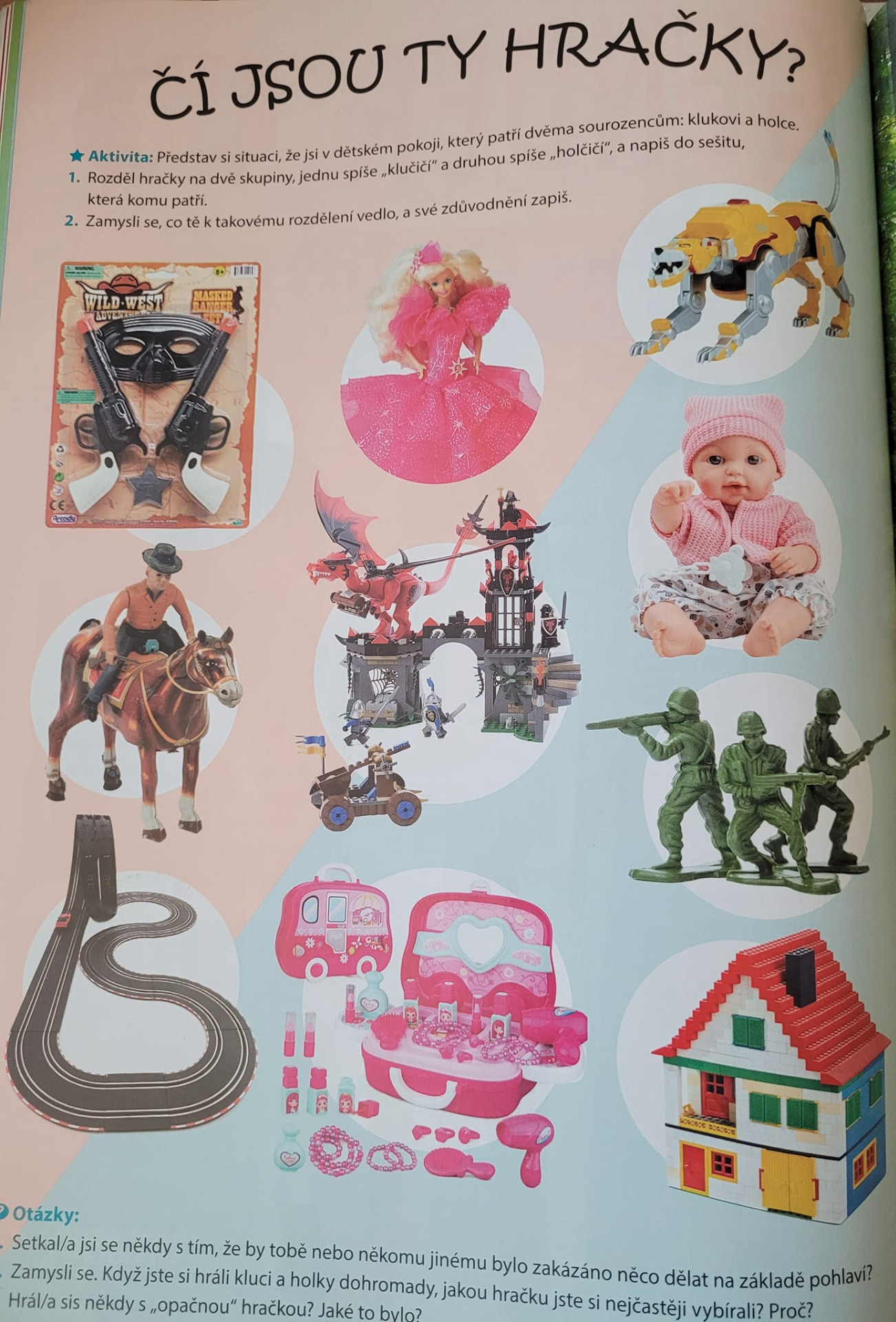 Z učebnice pro základní školy. A pak se divme. Druhý snímek končí návodnou otázkou: Hrál/a sis někdy s "opačnou" hračkou? Jaké to bylo?...ale zase buďme rádi, že tato otázka podsouvající dětem genderismus nezačíná takto: "Hrálo sis někdy...